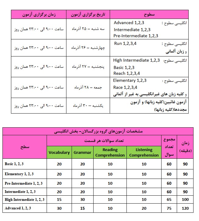 جدول زمانبندی آزمون پایانی ترم تابستان کانون زبان