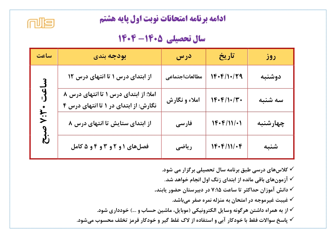اصلاحیه برنامه امتحانی نوبت اول